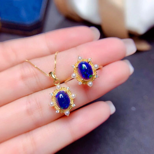 925 Sterling Silver Marquise Opal Necklace & Ring Set