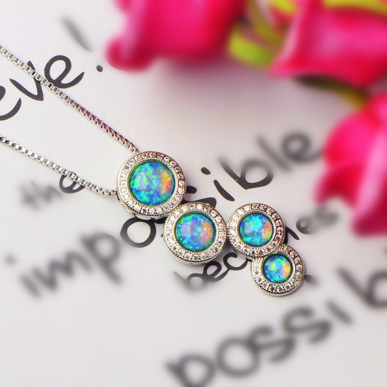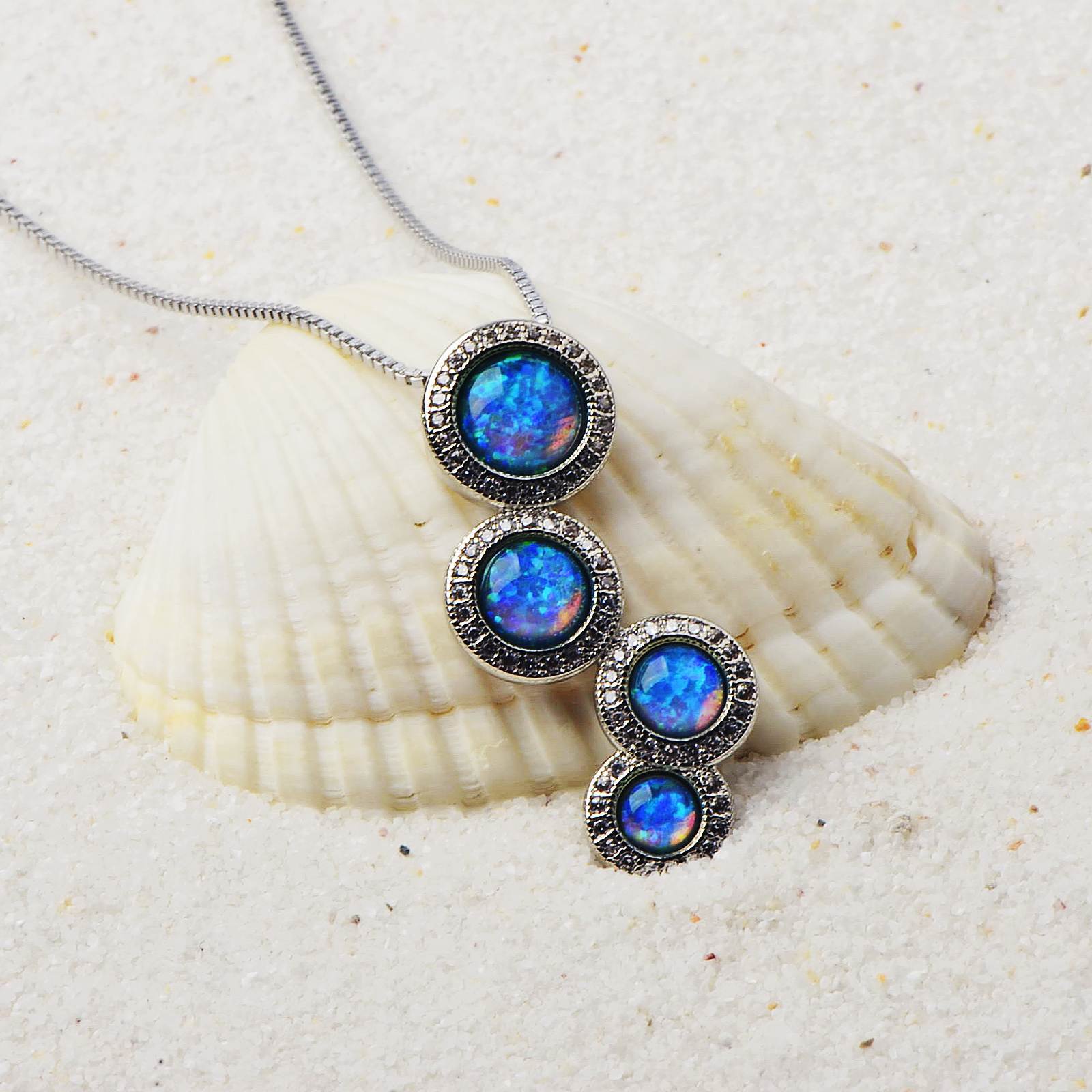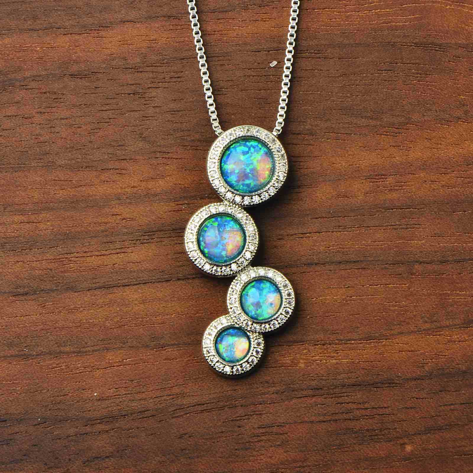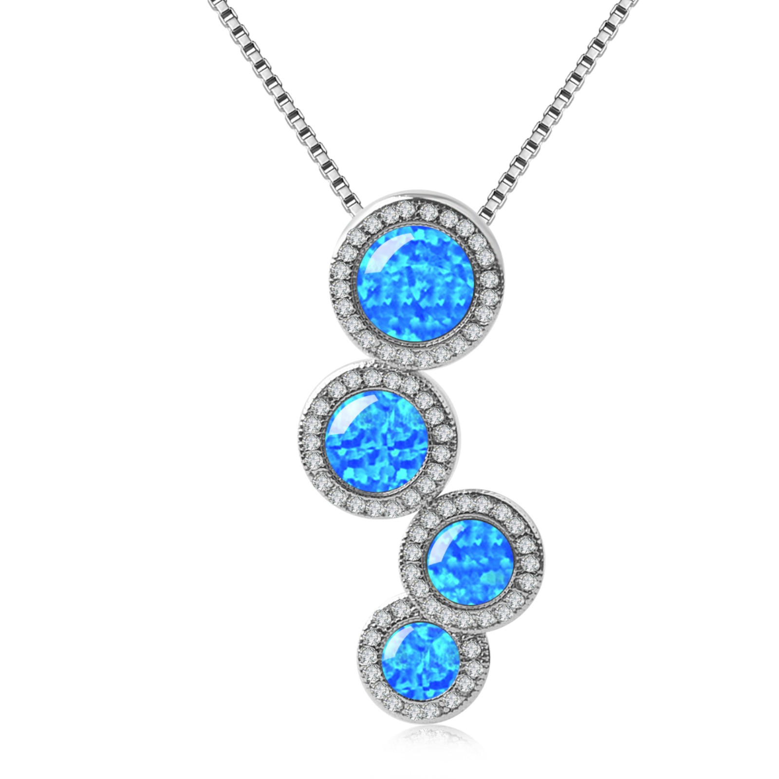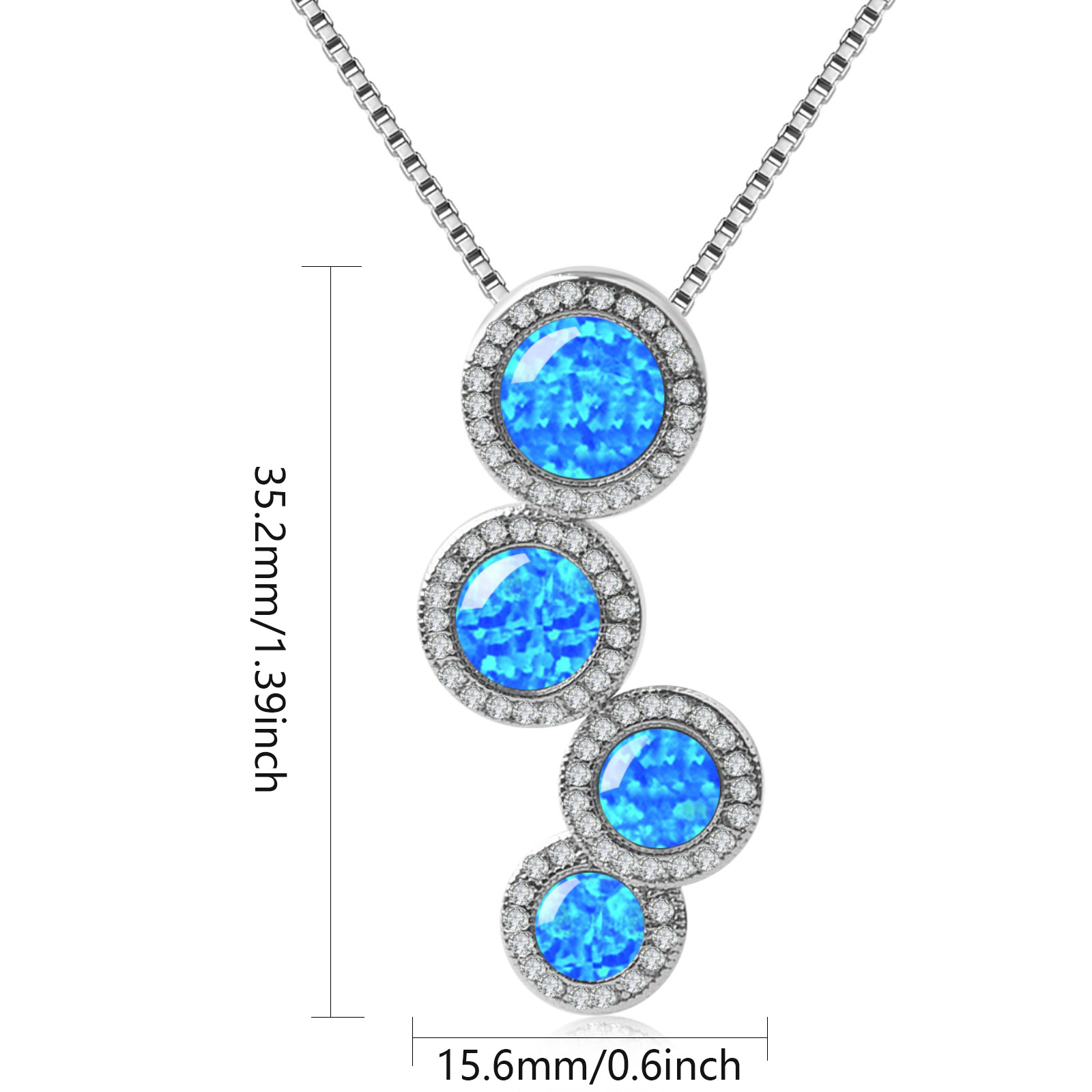 Turn heads with this elegant blue fire opal circle pendant necklace .Designed with linked halo circles, each featuring vibrant synthetic blue opal , this pendant sparkles beautifully in light. Its cascading vertical design symbolizes clarity, balance, and flow — perfect for adding sophistication to everyday wear or gifting someone special.