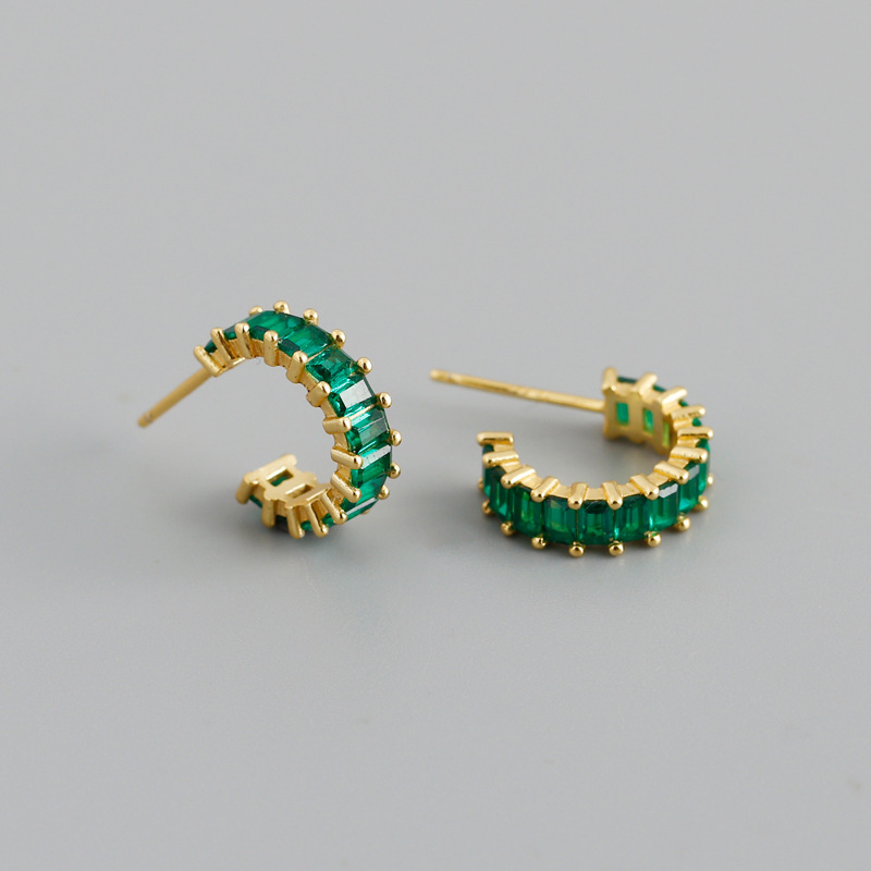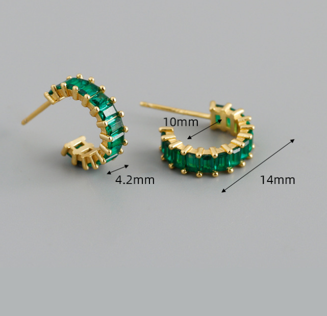 These elegant sterling silver huggie hoop earrings feature a sleek half-hoop design accented with sparkling green baguette-cut stones. Their minimalist silhouette makes them perfect for everyday wear, while the refined sparkle adds sophistication for evenings and special occasions. A versatile and timeless piece designed to elevate any jewelry collection.
